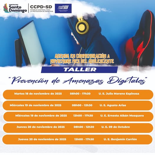 El Consejo Cantonal para la Protección de Derechos de Santo Domingo organiza el taller “Prevención de Amenazas Digitales” del 18 al 20 de noviembre de 2025 en diferentes unidades educativas del sector.